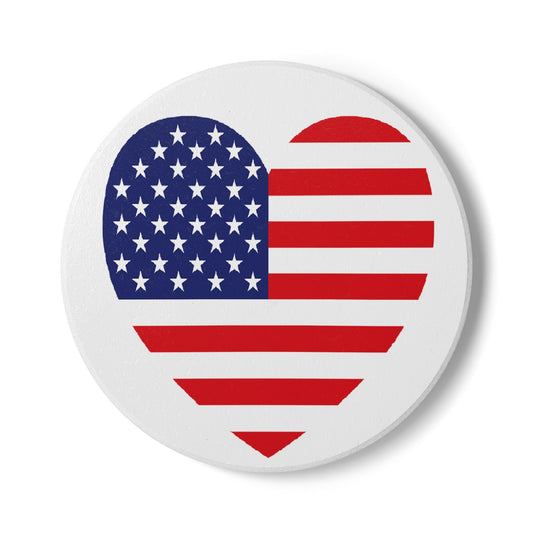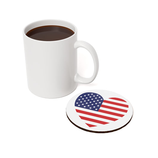 American Flag Heart Round Hardboard Coaster, Cork Backing 3.75"x3.75", USA Flag Coaster Memorial Day, 4th of July Decor, Priced per coaster