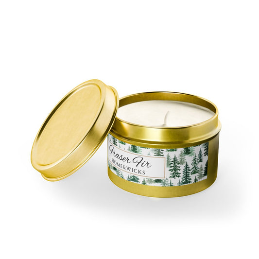 Fraser Fir Coconut Soy Wax Candle, 4 oz. Gold Tin Jar with Lid -Christmas Candle, Holiday Decor, Winter Candle