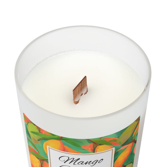 Mango Coconut Scented Coconut Blended Wax Candle, 11 oz. Frosted Jar with Wood Wick and Maple Wood Lid, Tropical Candle, Fruity Candle