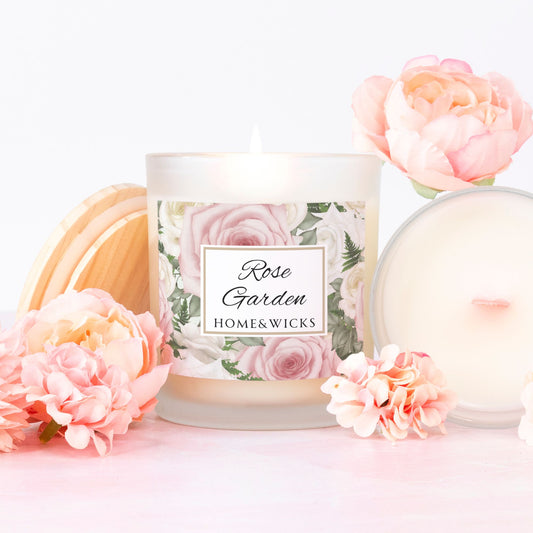 Rose Garden Coconut Apricot Wax Candle, 11 oz. Frosted Jar with Pink Wood Wick, Maple Wood Lid - Floral Scented Candle, Rose Garden Candle