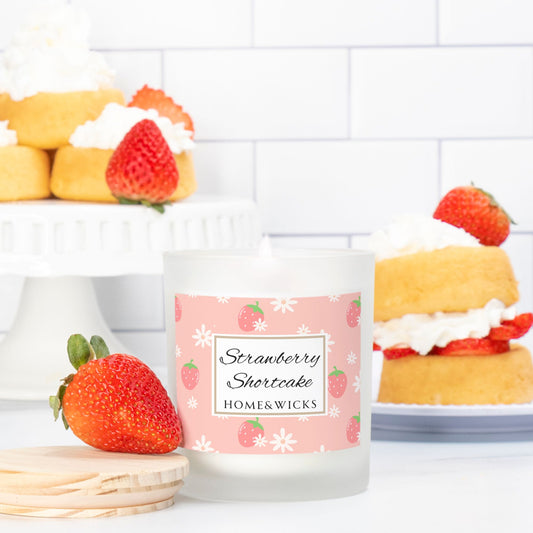 Strawberry Shortcake Coconut Apricot Wax Candle, 11 oz Frosted Jar, Pink Wood Wick, Maple Wood Lid - Gourmand Scented Candle, Fruity Candle