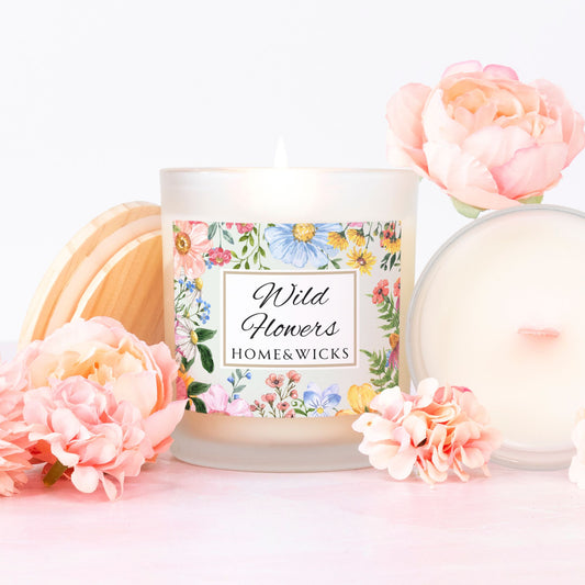 Wild Flowers Coconut Apricot Wax Candle, 11 oz. Frosted Jar with Pink Wood Wick and Maple Wood Lid - Green Floral Aromatic Scented Candle