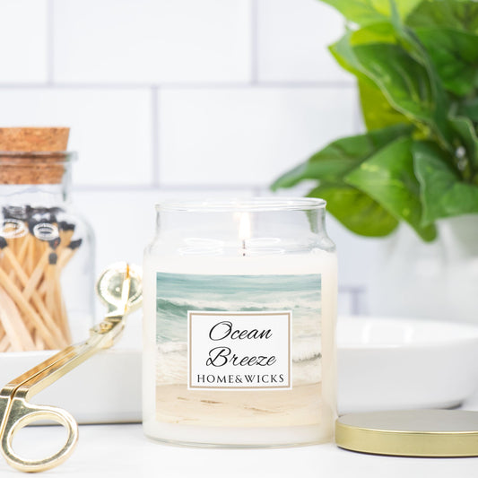 Ocean Breeze 9 oz Coconut Apricot Wax Candle, Apothecary Jar with Gold Lid, Cotton Wick - Coastal Home Decor, Ocean Candle, Beach Candle