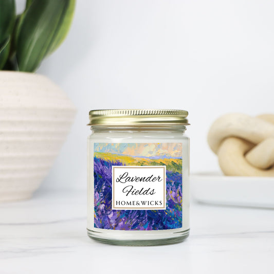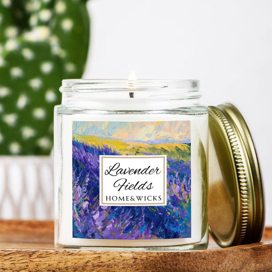 Lavender Fields Coconut Apricot Wax Candle, 9 oz. Clear Jar with Gold Lid - Lavender Scented Candle, Lavender Home Decor, Spa Floral Candle