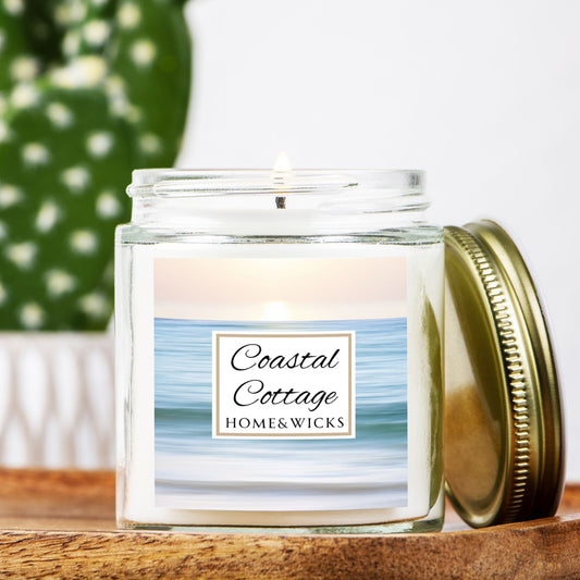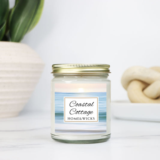 Coastal Cottage 9 oz. Coconut Apricot Wax Candle, Clear Jar with Gold Lid - Coastal Candle Decor, Ocean Scented Candle, Beach Decor