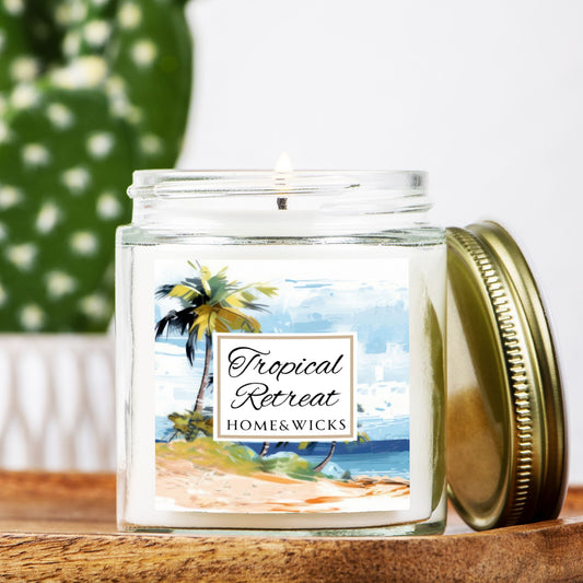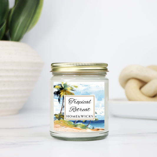 Tropical Retreat Scented 9 oz. Coconut Soy Wax Candle, Clear Jar with Gold Lid, Cotton Wick