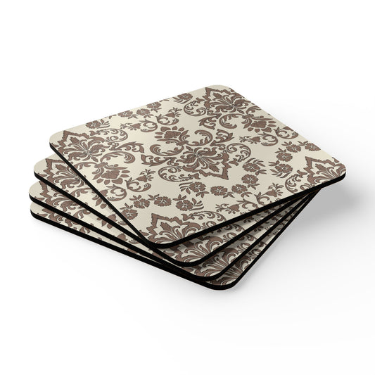 Baroque Mocha Square Coasters, Set of 4, Cork Backed Coasters, Stylish Home Decor, Fall Autumn Table Decor, Brown Coaster Gift Set, 3.75" x 3.75"
