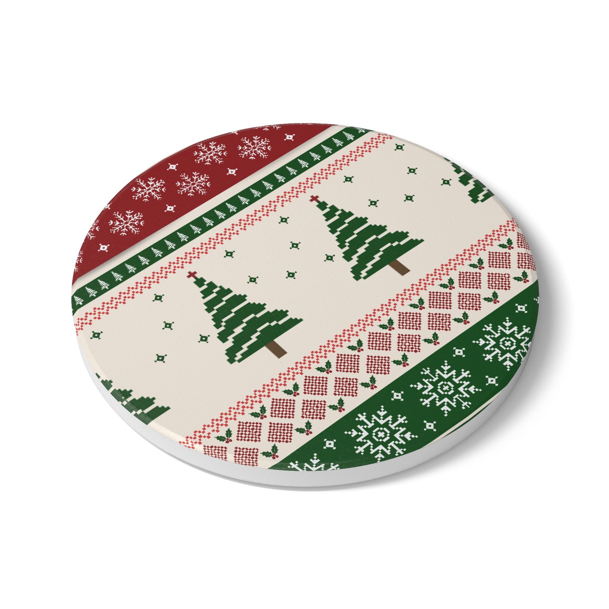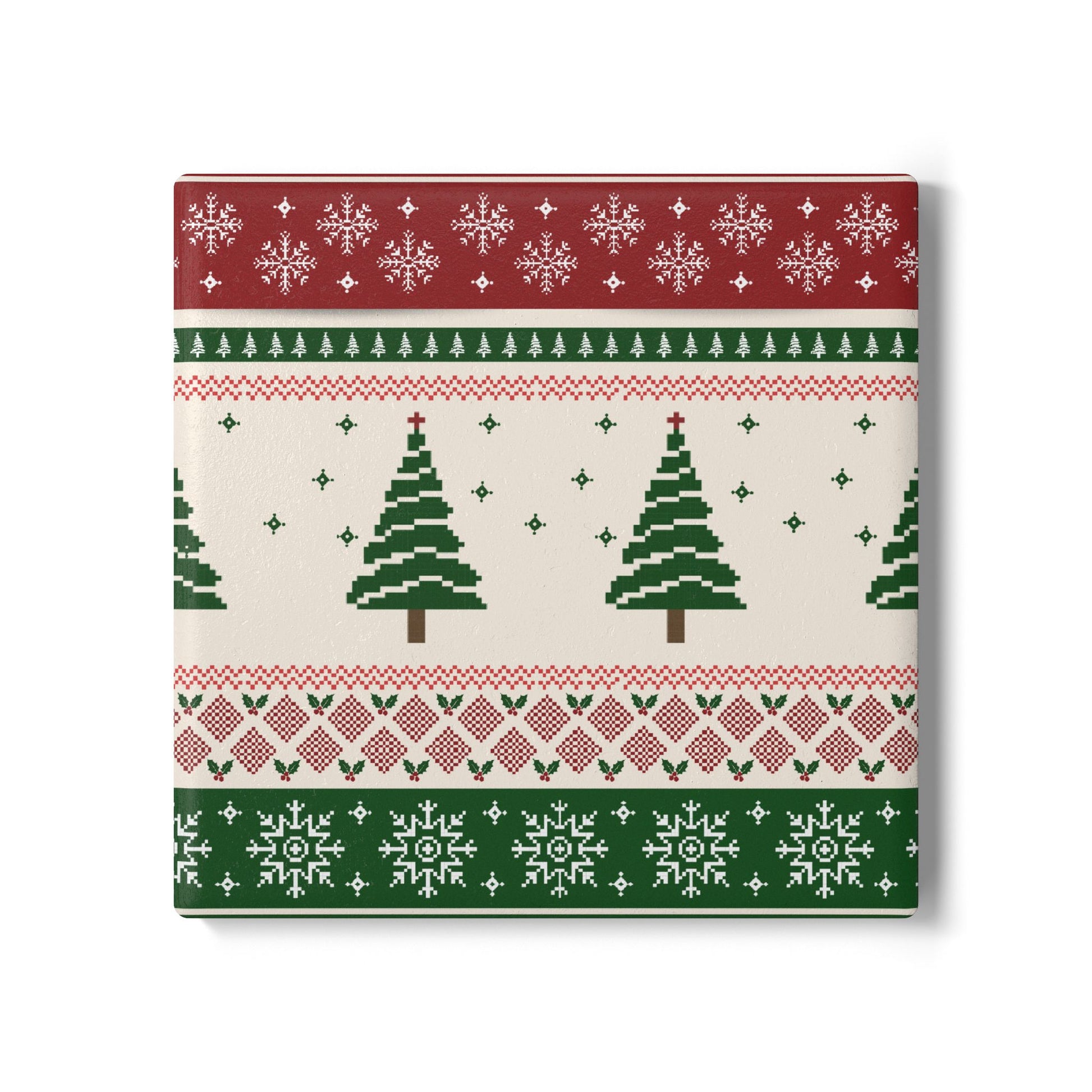 Warm, cozy, and quietly festive — this Christmas Tree Ribbons ceramic tile coaster brings the hush of a Christmas to your tabletop. The snug knit-pattern design, lined with rows of evergreen silhouettes and tiny snowflakes, makes each cup feel like a moment of slow, seasonal comfort. Durable white ceramic holds up to hot or cold drinks while the cork backing keeps mugs steady and surfaces safe. It slips effortlessly into a holiday table setting, a quiet morning coffee ritual, or an evening with a favorite book and soft lights. Perfect for Christmas dinners, holiday gatherings and everyday winter decor.