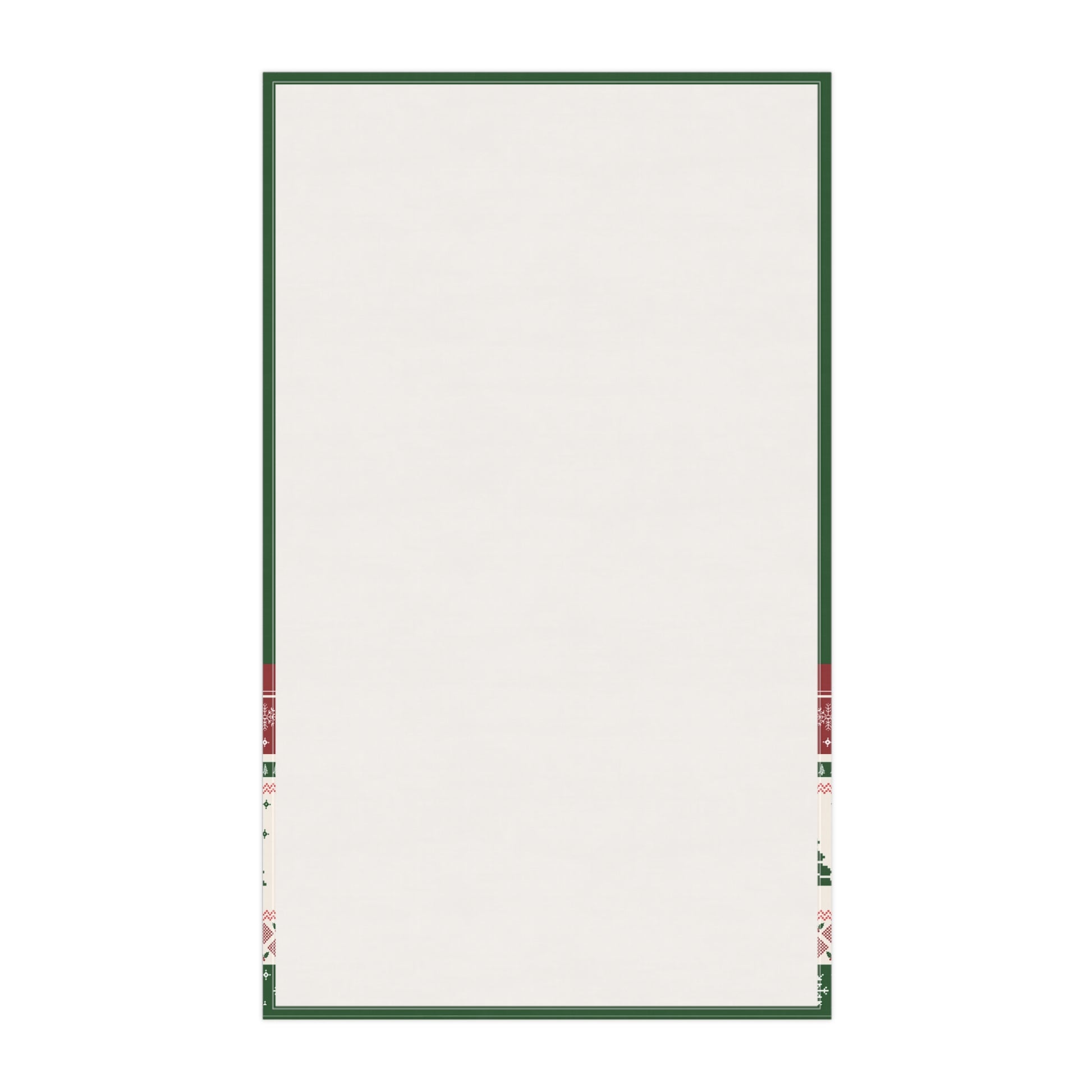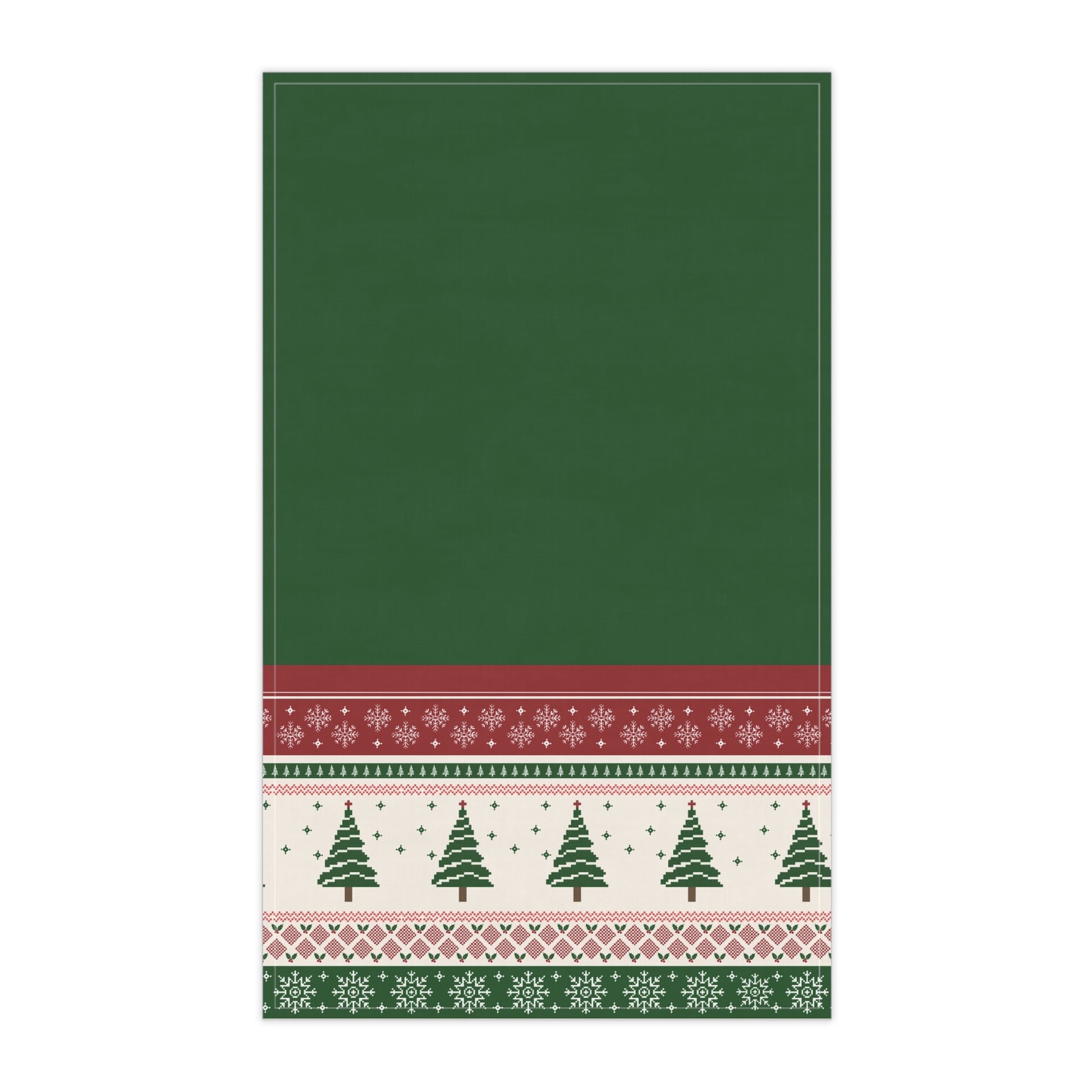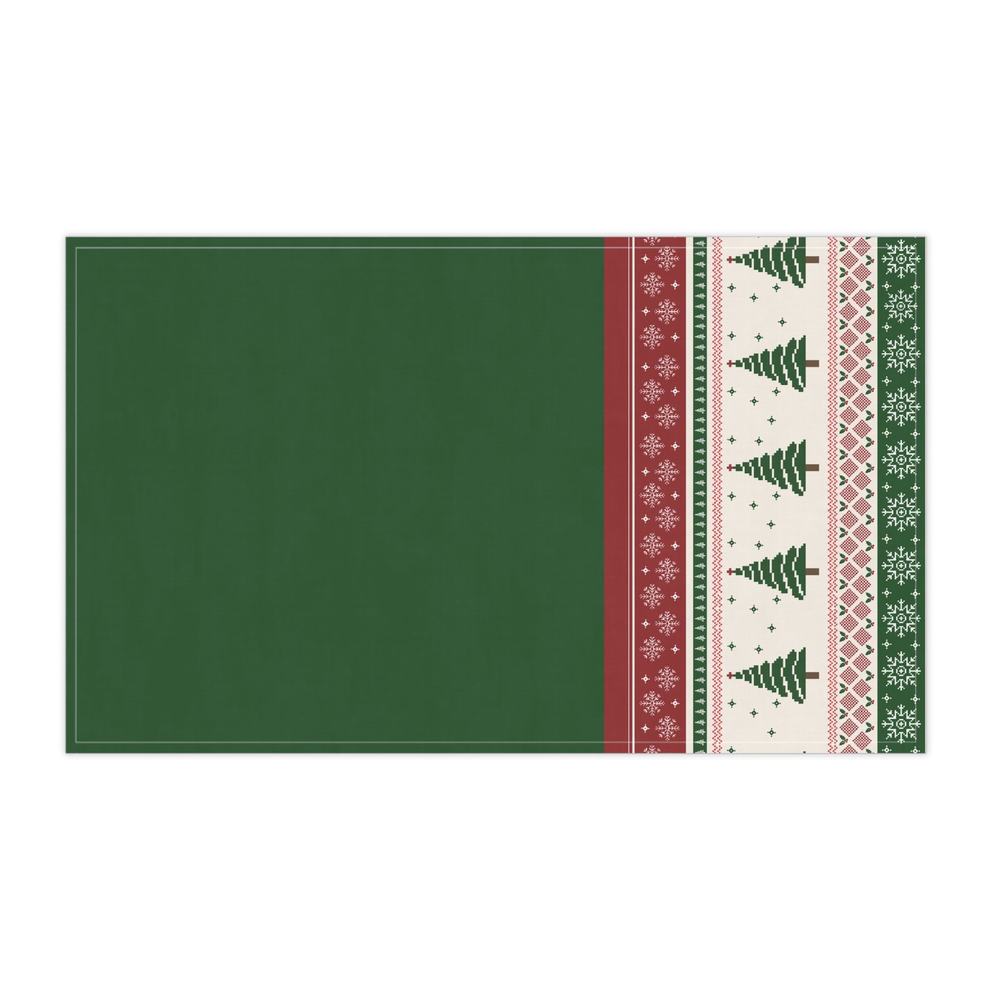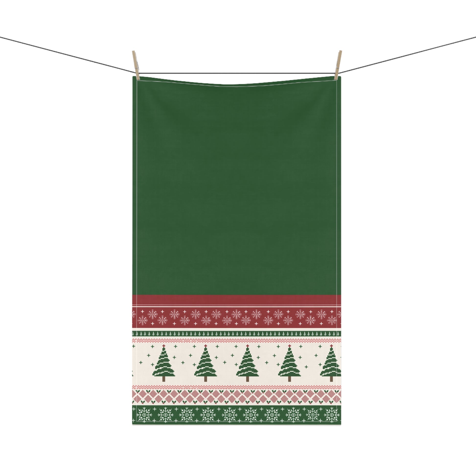A warm, kitchen-ready Christmas Trees cotton twill tea towel that brings the quiet charm of a cozy holiday cheer into everyday tasks. Deep forest green fills most of the cloth like a winter blanket, while the bottom edge features a knitted-inspired band of tiny green trees, snowflakes, and fair isle motifs in cream, red, and green. Lightweight and soft (choose cotton twill for absorbency or polyester for stretch and vivid color), it drapes neatly over an oven handle or hangs ready by the sink. The hemmed edges hold up to repeated use and washes, and the single-sided print keeps the pattern crisp where it’s seen most. It’s the kind of towel that makes dish duty feel a little more like tending a fireside moment.